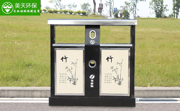 詳情咨詢(xún):4008-787-781, 這款垃圾桶頂部采用加厚不銹鋼制作,一次成型,桶身采用電鍍鍍鋅噴塑工藝,設(shè)有不銹鋼滅煙缸,帶四君子圖案。