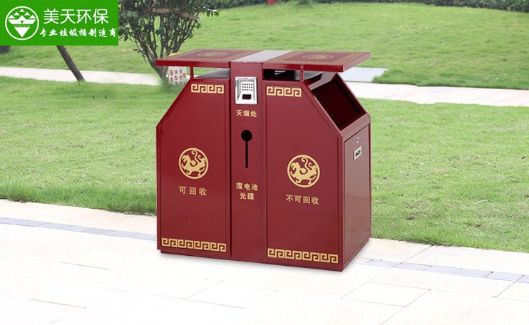 - 說(shuō)明: MT-G11采用優(yōu)質(zhì)電解鍍鋅板加戶外烤漆制作而成,古典印花,設(shè)有滅煙處和廢電池光碟回收處,斜面垃圾投口,適用于景區(qū)、公園、小區(qū)等場(chǎng)合。